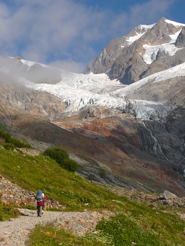 par *V* ~ Mardi 19 août 2008. Classé dans : Montagne, Tour du Mont Blanc - Kora des JO pour le Tibet.Journée franco-italienne au programme. Après être revenu sur nos pas pour chercher les marcheurs ayant bivouaqué en bas, puis remonté la même pente que la veille sous le refuge (ou comment faire bêtement 200 mètres de dénivelé pour rien… j’suis pas maligne des fois), on commence tranquillement cette journée en marchant dans le joli vallon de la Lée Blanche.