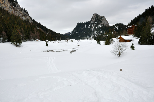 Au col de Tanay, on débouche sur un superbe vallon. Le lac est caché par la neige mais on devine son emplacement. Le sommet du Grammont nous nargue, mais ce sera pour une autre fois : la météo très couverte et le manque de condition physique ont eu raison de notre volonté (le gramme d’éthanol dans le sang restant de la soirée précédente n’a sans doute pas aidé non plus… mais ceci est une autre histoire).