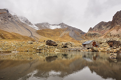 On débouche ensuite dans le vallon de Vallonpierre. On arrive sur un très beau plateau, à l’herbe jaunie. Ça donne fortement envie d’y faire un joli bivouac ! On rejoint le refuge, au pied d’un petit lac. Le coin est vraiment superbe malgré la météo couverte. Le bâtiment est récent, et l’extérieur fait de bois et de pierre est plutôt joli et bien intégré au paysage. A cette saison, le refuge n’est pas gardé, mais il reste ouvert avec tout le confort nécessaire : matelas et couvertures, une grande cuisine avec même du gaz et des bidons pour stocker l’eau, et surtout l’indispensable poêle avec quelques bûches. Malheureusement, les arbres sont rares dans le coin pour trouver de nouvelles bûches à brûler…