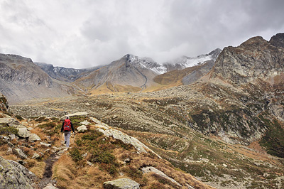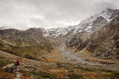 On laisse le véhicule près du refuge du Gioberney, puis on emprunte un long vallon assez plat. On a la montagne pour nous tous seuls, c’est royal malgré le ciel gris. Cette époque de l’année en montagne, juste avant les premières neiges, est vraiment l’une de mes préférées. On peut savourer encore un peu la montagne estivale, tout en profitant du silence et d’un calme impressionnant.