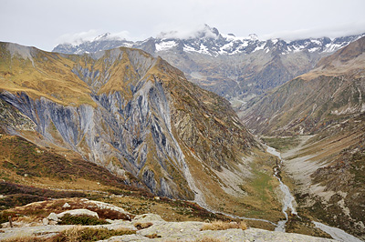 Une courte montée nous mène au petit refuge de Chabournéou. On s’y abrite le temps d’un casse-croûte. On repart ensuite par un joli sentier en balcon, au pied des glaciers du Sirac. L’ambiance est très haute-montagne, et on voit plusieurs chamois d’assez près.