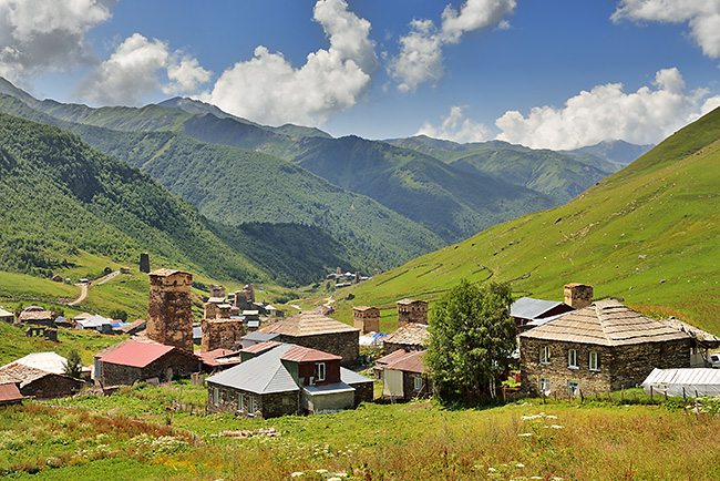 Le paysage, avec les tours svanes face à une magnifique paroi glaciaire, est vraiment saisissant. On comprend aisément pourquoi le coin est touristique malgré son isolement. Le mont Chkhara, plus haut sommet géorgien avec ses 5193 m d’altitude, se laisse apercevoir un moment. De l’autre côté des faces enneigées, c’est la grande Russie.