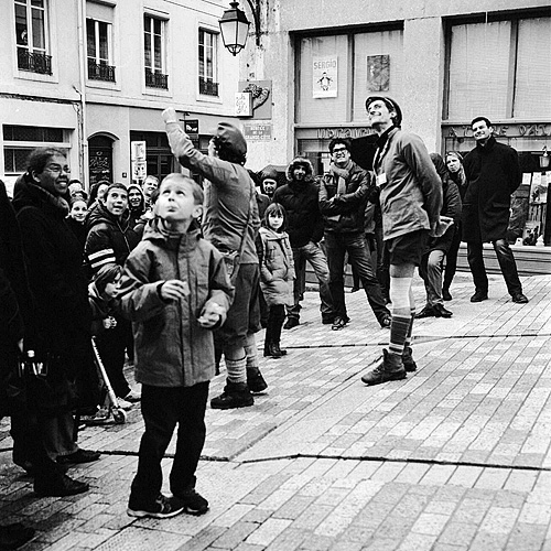 Dans le quartier historique de la Croix-Rousse, ancien haut-lieu de l''industrie de la soie, tout est bon pour appâter le touriste, comme ces guides en pseudo-costumes d'époque ! Rolleiflex 3.5F Planar - Kodak Tri-X 400 - Kodak D76 1+1
