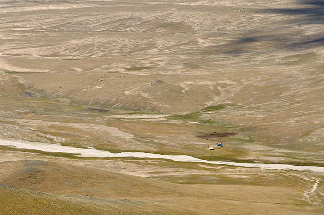 Yourte et roulotte de bergers kirghizes, perdus dans l'immensité...